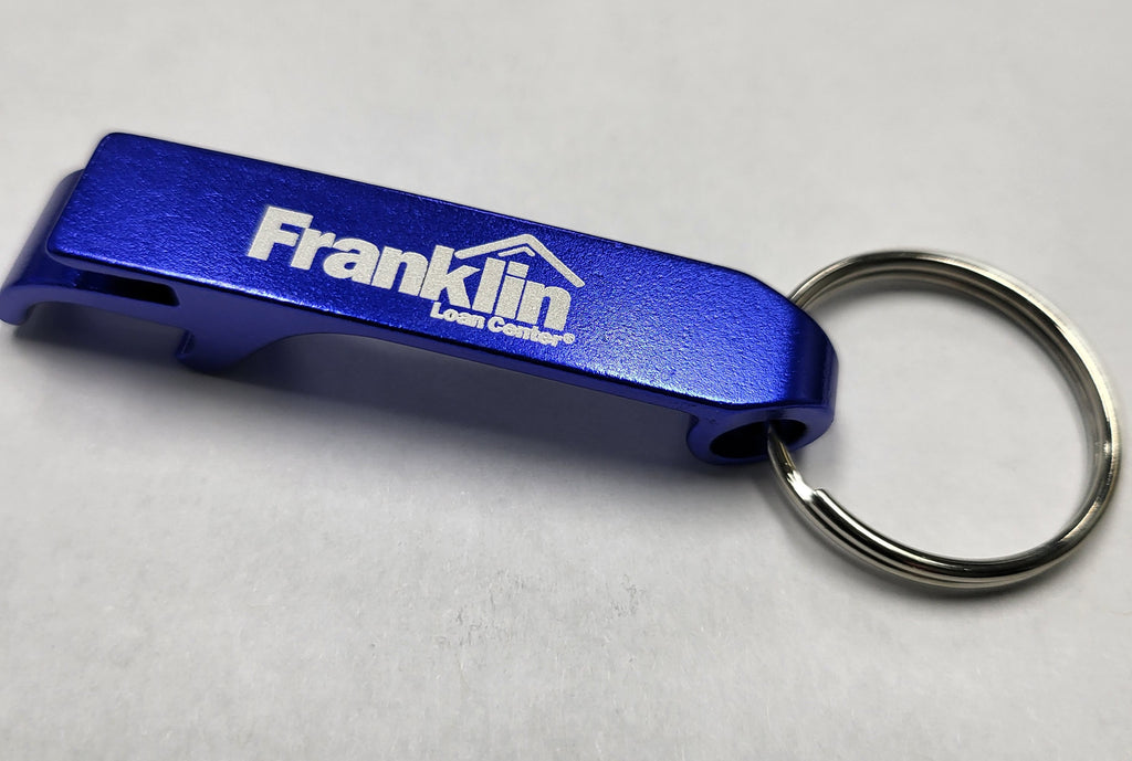 Compact, durable, and ready when you need it. This aluminum keychain doubles as a bottle opener, making it a handy companion for tailgates, events, or casual nights in. Branded with the Franklin Loan Center logo in bold white on a metallic blue finish.